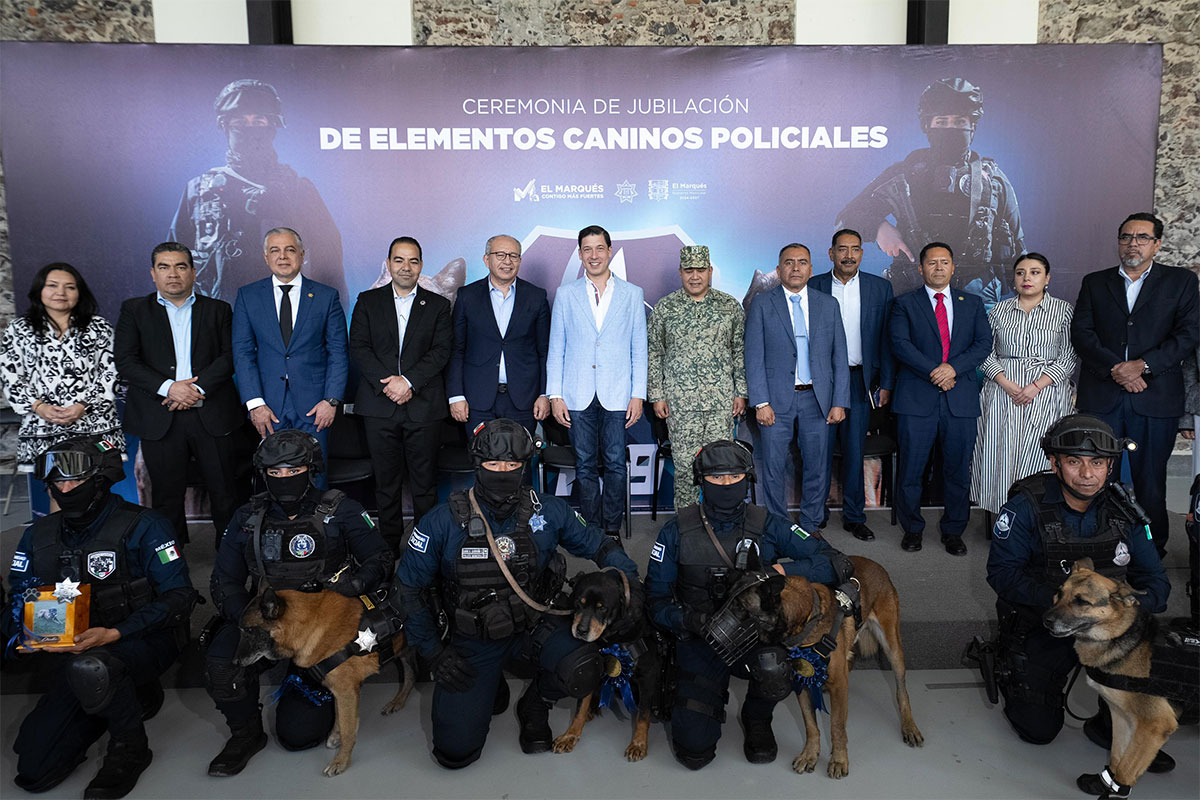 En un acto solemne, el presidente municipal de El Marqués, Rodrigo Monsalvo Castelán, encabezó la ceremonia de jubilación de tres elementos caninos policiales y el homenaje póstumo a un cuarto ejemplar, que formaron parte de la Unidad K9 de la Secretaría de Seguridad Pública Municipal (SSPM).