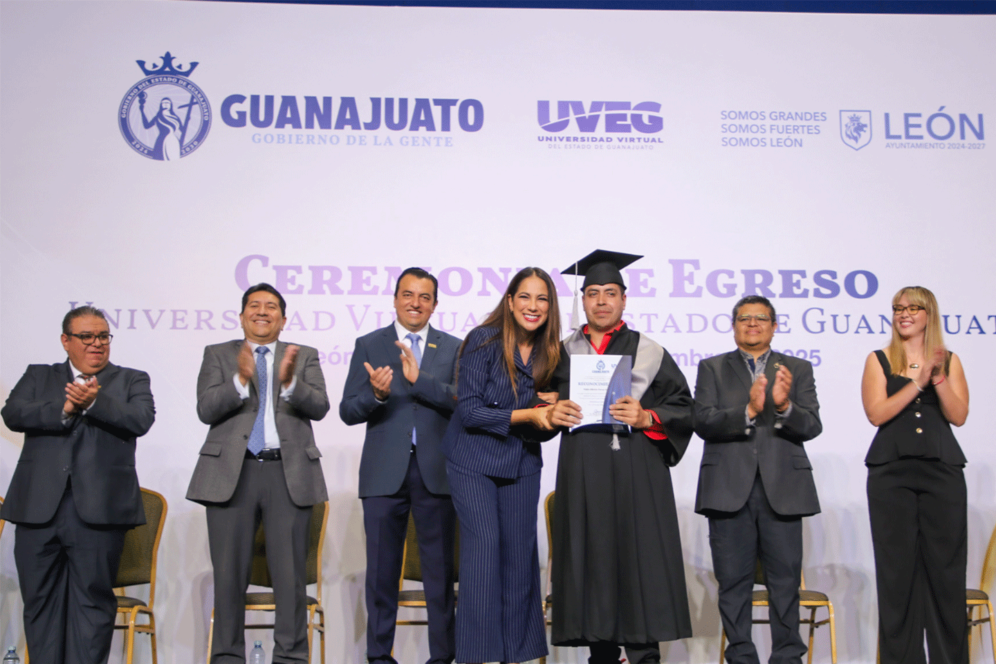 La gobernadora de la Gente, Libia Dennise García Muñoz Ledo, encabezó en el Poliforum León la Ceremonia Extraordinaria de Egresados de la Universidad Virtual del Estado de Guanajuato (UVEG) 2025, un evento que reunió a más de 1,700 personas entre estudiantes, familias y docentes.