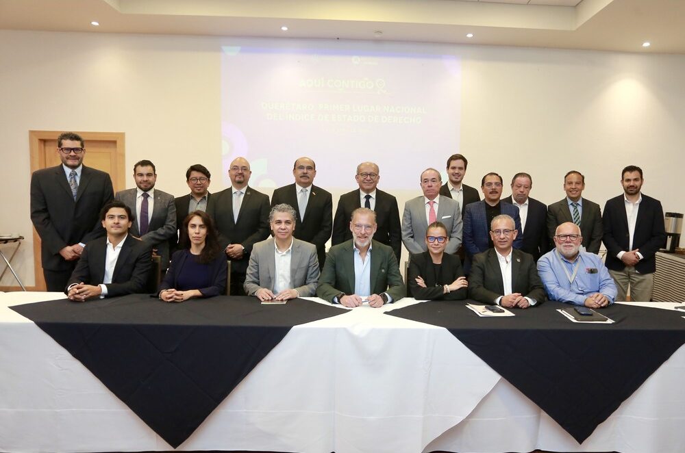 Juan Martín Granados Torres, asesor en Políticas Públicas del estado, informó que el World Justice Project colocó a Querétaro en el primer lugar nacional, tercera ocasión consecutiva en este ranking. El índice evalúa límites al poder gubernamental, ausencia de corrupción, gobierno abierto, derechos fundamentales, orden y seguridad, cumplimiento regulatorio, justicia civil y justicia penal. Alejandro González Arreola, director de la Oficina de Compromiso del World Justice Project, expuso que este instrumento permite identificar áreas de oportunidad y contribuye a la toma de decisiones en sectores público y privado.