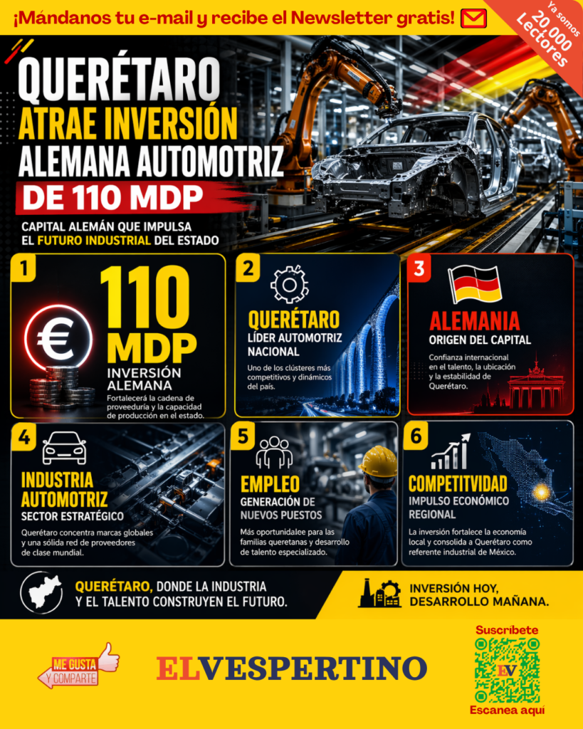 Opinión Inversión alemana en Querétaro, TRW: 110 millones en sistemas de dirección automotriz by Frida Ferven 21 de abril de 2026 written by Frida Ferven 21 de abril de 2026 0 comment Bookmark 33 Comparte esto: Comparte en Facebook (Se abre en una ventana nueva) Facebook Compartir en X (Se abre en una ventana nueva) X Me gusta esto:Me gusta Cargando... infografíaInversión en QuerétaroMarco Del PreteQuerétaroSedesu Share 0 FacebookTwitterPinterestEmail previous post Se comenta en La Sobremesa de hoy que…El Marqués creció 99% en una década. You may also like Bookmark Encuesta Querétaro 2026: Morena cierra brecha con PAN... 20 de abril de 2026 Bookmark Morena busca ampliar presencia electoral en Querétaro para... 17 de abril de 2026 Leave a Comment Cancel Reply Save my name, email, and website in this browser for the next time I comment. Δ