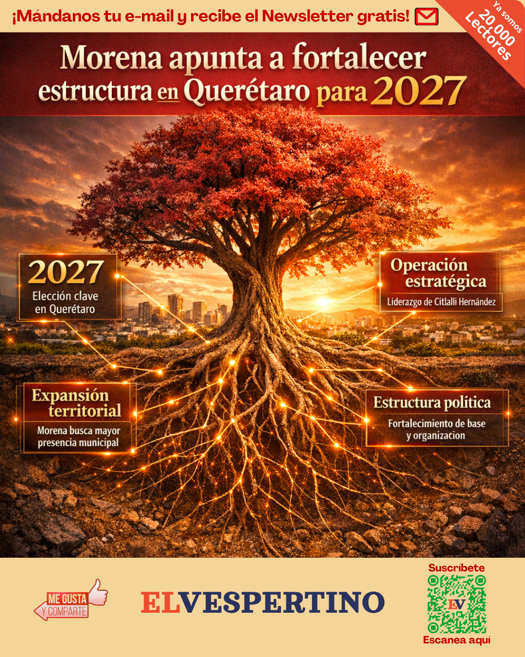 Opinión Morena busca ampliar presencia electoral en Querétaro para 2027 by Frida Ferven 17 de abril de 2026 written by Frida Ferven 17 de abril de 2026 0 comment Bookmark 20 Comparte esto: Comparte en Facebook (Se abre en una ventana nueva) Facebook Compartir en X (Se abre en una ventana nueva) X Me gusta esto:Me gusta Cargando... Elecciones 2027MorenaQuerétaro Share 0 FacebookTwitterPinterestEmail previous post Se comenta en La Sobremesa de hoy que…Sheinbaum viaja a España en defensa de democracia You may also like Bookmark Respuesta coordinada de gobiernos a evento de seguridad... 16 de abril de 2026 Bookmark Die Casting Querétaro: 4.7 mil millones de dólares... 15 de abril de 2026 Leave a Comment Cancel Reply Save my name, email, and website in this browser for the next time I comment. Δ