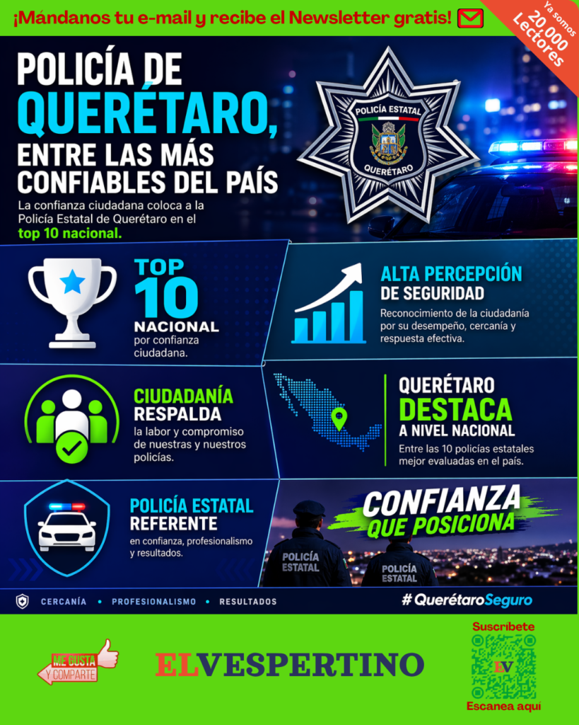 Opinión Querétaro alcanza posiciones líderes en confianza y desempeño policial nacional by Frida Ferven 24 de abril de 2026 written by Frida Ferven 24 de abril de 2026 0 comment Bookmark 24 Comparte esto: Comparte en Facebook (Se abre en una ventana nueva) Facebook Compartir en X (Se abre en una ventana nueva) X Me gusta esto:Me gusta Cargando... infografíaPOESQuerétaro Share 0 FacebookTwitterPinterestEmail previous post Se comenta en La Sobremesa de hoy que Arturo Maximiliano asumirá coordinación Morena You may also like Bookmark Givaudan invierte 3,120 millones en Querétaro: dos proyectos... 23 de abril de 2026 Bookmark Tequisquiapan: 3.2 millones de pesos en pavimentación y... 22 de abril de 2026 Leave a Comment Cancel Reply Save my name, email, and website in this browser for the next time I comment. Δ
