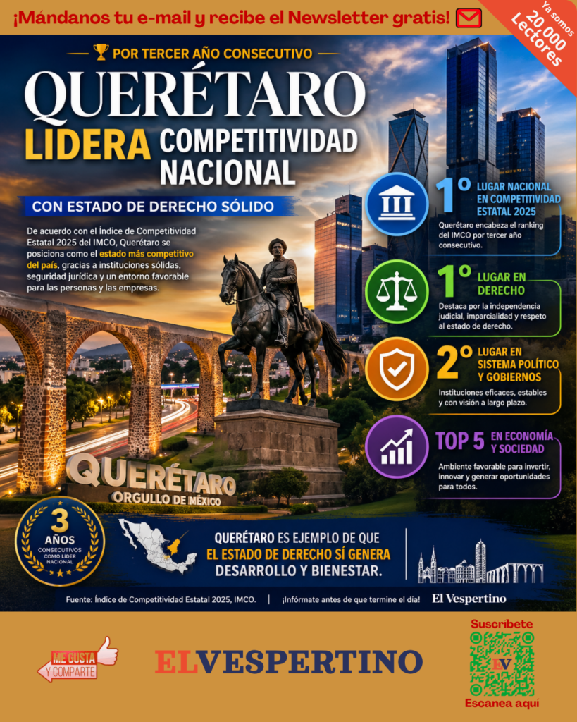 Opinión Querétaro lidera ranking nacional de Estado de Derecho 2026 de World Justice Project by Frida Ferven 29 de abril de 2026 written by Frida Ferven 29 de abril de 2026 0 comment Bookmark 21 Comparte esto: Comparte en Facebook (Se abre en una ventana nueva) Facebook Compartir en X (Se abre en una ventana nueva) X Me gusta esto:Me gusta Cargando... CompetitividadinfografíaMauricio KuriQuerétaro Share 0 FacebookTwitterPinterestEmail previous post Se comenta en la sobremesa de hoy…que el gobernador de Sinaloa enfrenta acusaciones federales de narcotráfico You may also like Bookmark Expansión SIG Querétaro 2026-2028: inversión de 1,910 millones... 28 de abril de 2026 Bookmark Gobierno estatal moderniza escuelas primarias con 16 millones... 27 de abril de 2026 Leave a Comment Cancel Reply Save my name, email, and website in this browser for the next time I comment. Δ